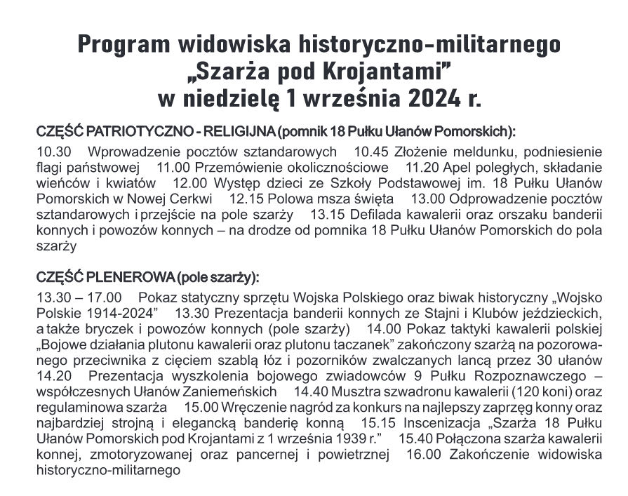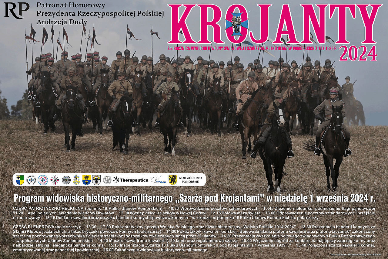 Gmina Chojnice, Fundacja „Szarża Pod Krojantami” oraz Szkoła Podstawowa w Nowej Cerkwi serdecznie zapraszają do Krojant w niedzielę, 1 września 2024 roku, na widowisko historyczno-militarne pt. „Szarża pod Krojantami”. Województwo Pomorskie jest współorganizatorem tej imprezy.